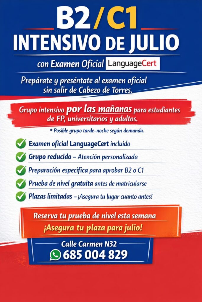 ¿Necesitas el B1 o B2 de inglés para graduarte? ¿Quieres un título oficial rápido y reconocido internacionalmente? En English Learning Center te ofrecemos matrícula abierta, cursos intensivos y clase de prueba gratuita. Contáctanos y empieza ya tu preparación con la academia de inglés para universitarios más especializada en Murcia.